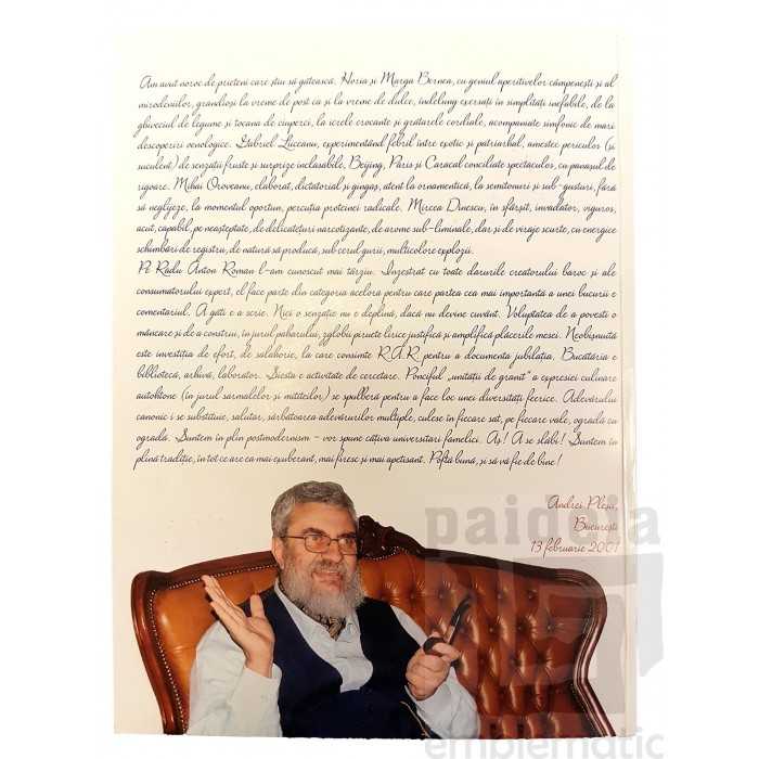 Radu Anton Roman a fost înzestrat cu toate darurile creatorului baroc și ale consumatorului expert, el face parte din categoria acelora pentru care partea cea mai importantă a unei bucurii este comentariul. „A găti e a scrie. Nmici o senzație nu e deplină, dacă nu devine cuvânt. Voluptatea de a povesti o mâncare și de a construi, în jurul paharului, zglobii piruete lirice justifică și amplifică plăcerile casei. Neobișnuită este investiția de efort, de salahorie, la care consimte R.A.R. pentru a documenta jubilația. Bucătăria e bibliotecă, arhivă, laborabor. Siestea e activitate de cercetare. Ponciful unității de grant a expresiei culinare autohtone în jurul sarmalelor și mititeilor, se spulberă pentru a face loc unei diversități feerice. Adevărului canonic i se substituie, salutar, sărbătoarea adevărurilor multiple, culese în fiecare sat, pe fiecare vale, ogradă cu ogradă. Suntem în plin postmodernism – vor spune câtiva universitari famelici. Aș! A se slabi! Suntem în plină tradiție, în tot ce are ea mai exuberant, mai firesc și mai apetisant”, conform lui Gabriel Liiceanu. Volumul reprezintă o invitație concretă la cunoaștere precum și la aprecierea hranei, dar de asemenea, poate fi un cadou exclusivist tuturor celor îndrăgostiți de viața frumoasă